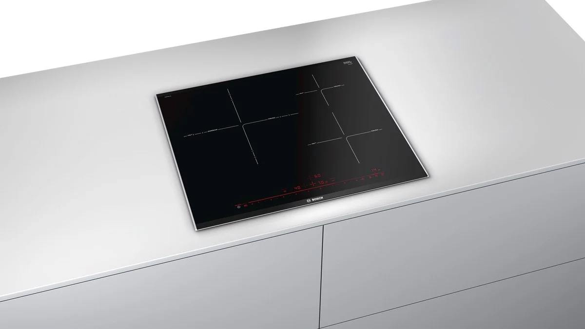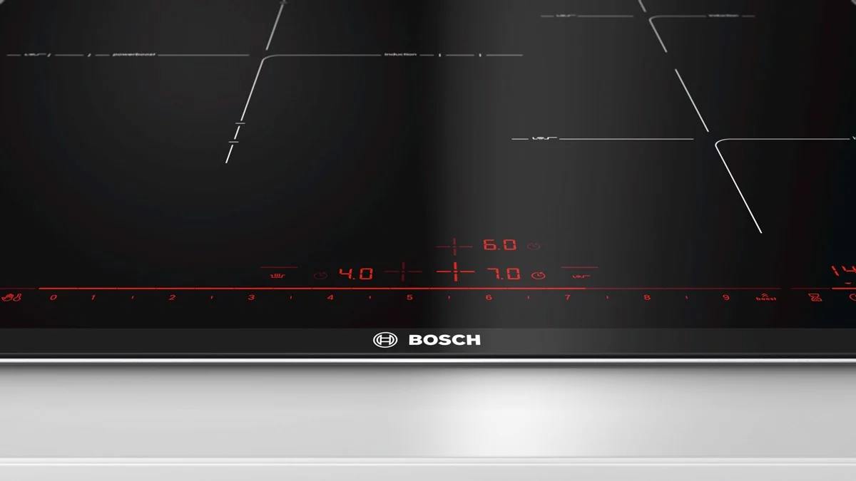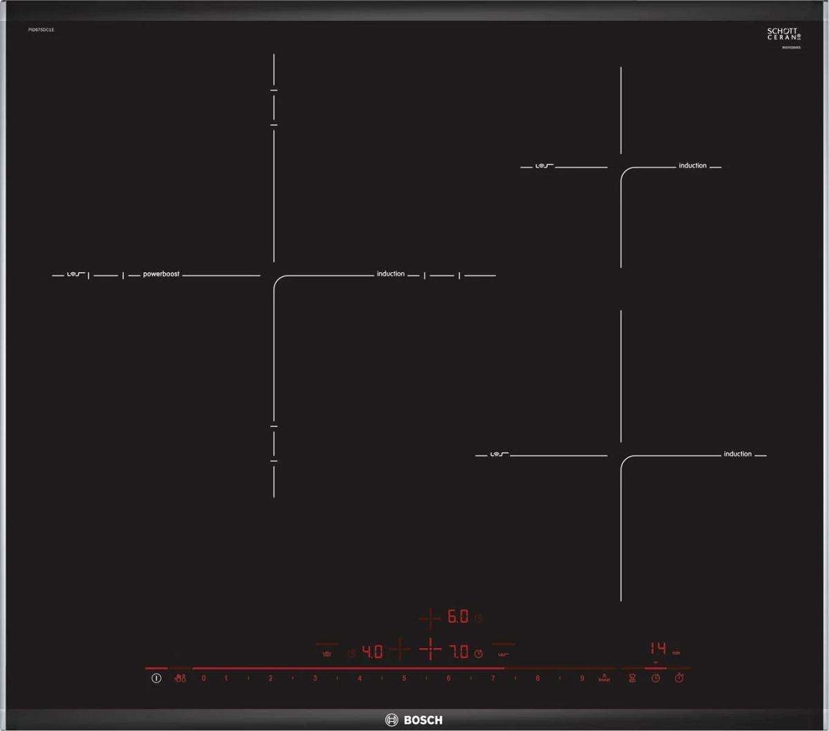 Bếp từ Bosch PID675DC1E sản xuất tại Tây Ban Nha, nhập khẩu trực tiếp từ Đức, gồm 3 vùng nấu cảm ứng với Sprint chức năng cho từng khu vực: