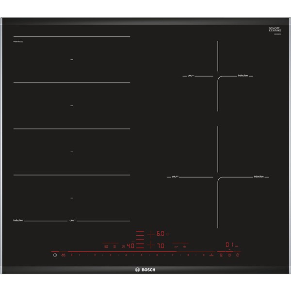 Bếp từ đa điểm Bosch PXE675DC1E có những chức năng vô cung tiện lợi. Màn hình kỹ thuật số TopControl kết hợp với điều khiển Direct-Select Premium, chỉ cần ấn nhẹ thì bạn đã có thể cài đặt sử dụng bếp rất dễ dàng.