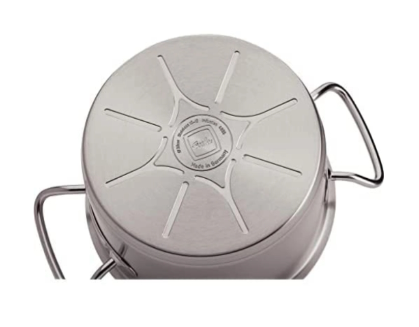 Cấu tạo đáy nồi Fissler Original Pro kết hợp 3 lớp kim loại để tối ưu hiệu quả của từng loại chất liệu: phần tiếp xúc với thức ăn bên trong là thép không gỉ 18/10 an toàn cho sức khỏe, ở giữa là phần đĩa nhôm 8mm giúp truyền dẫn nhiệt tốt nhất và lớp thép không gỉ 18/0 bên ngoài giúp nồi Fissler sử dụng tốt trên mọi loại bếp – kể cả bếp từ.