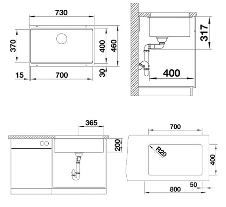 Chậu rửa tích hợp với gờ vòi liên tục: Nhiều không gian cho vòi và điều khiển từ xa chất thải bật lên - Thích hợp cho các đơn vị đế rộng 80 cm