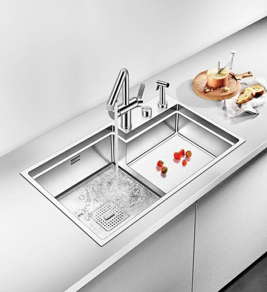 Hệ thống xử lý nước thải tiên tiến từ bộ lọc giỏ thép không gỉ, đếm bộ hệ thống xử lý thoát nước . Đáy chậu có cấu hình thấp giúp giải phóng thêm không gian tủ bếp nhà bạn
