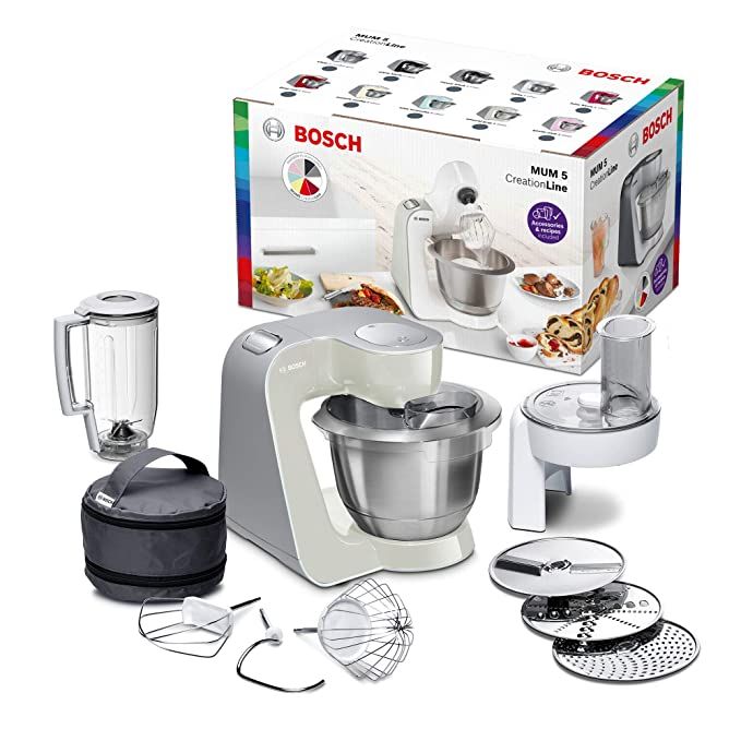 - Các phụ kiện được đựng trong 1 túi màu đen nhỏ gọn, bao gồm: 1 nắp đậy tô trộn, 1 đầu đảo/ khuấy, 1 đầu đánh kem, trứng, 1 đầu móc nhào bột nặng, 1 cối xay sinh tố, 1 vắt cam, 1 xay thịt, 3 đĩa cắt lát.