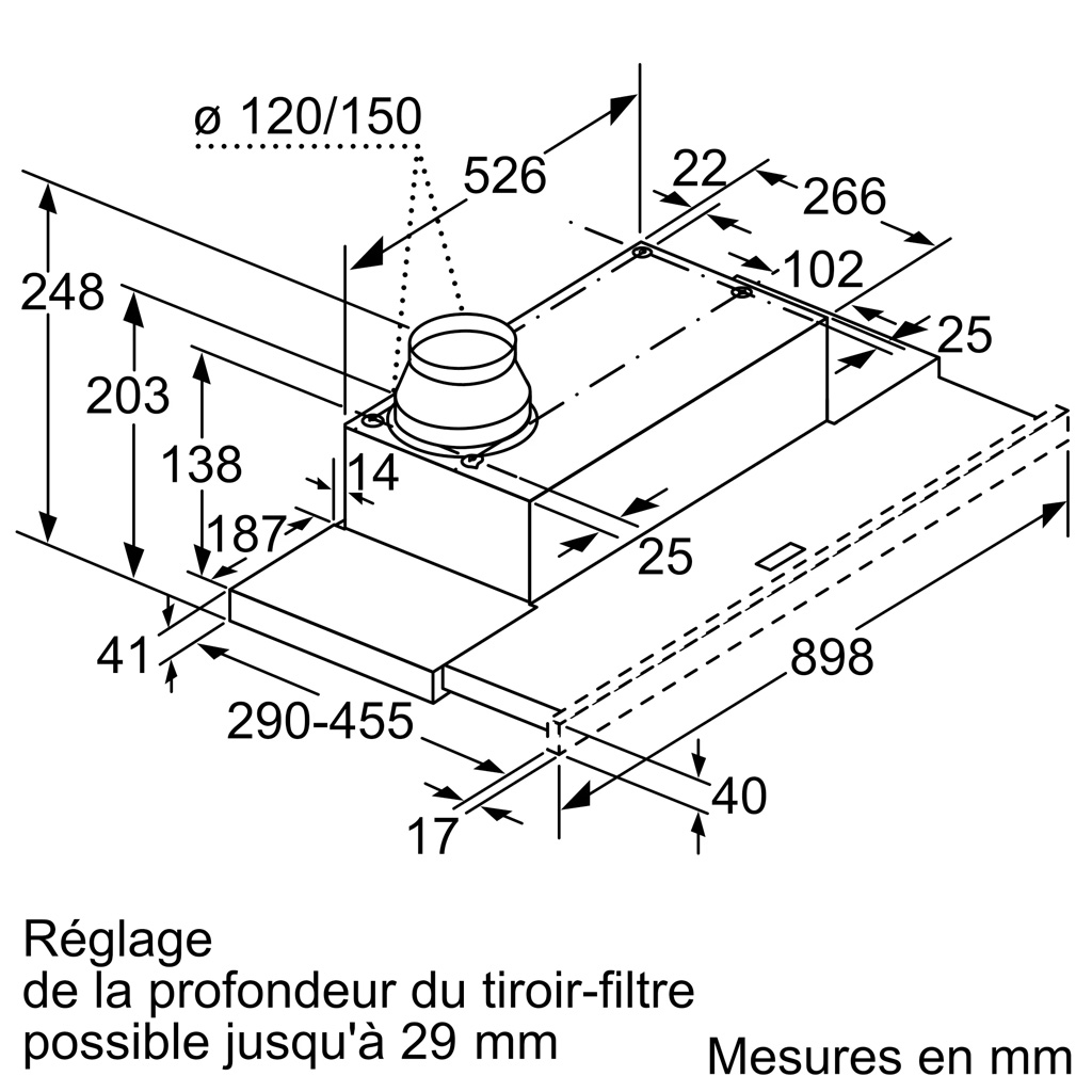 Kiểu dáng máy hút mùi âm tủ Bosch DFM094W53 với chiều rộng 90cm đặc biệt thích hợp cho mọi không gian bếp hiện đại. Tiết kiệm diện tích nhưng hiệu năng hút mùi mạnh mẽ với ống khói đường kính 150mm (kèm theo Ø 120 mm)