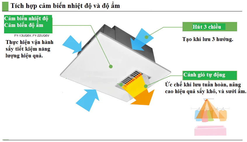 FY-13UG6V có thể thay thế một chiếc máy sấy khô quần áo thông thường. Vào các ngày mưa nôm ẩm ướt hay không gian phơi đồ ngoài trời bị hạn chế, bạn hoàn toàn có thể phơi đồ ngay bên trong nhà tắm mà không hề bị mùi hôi và khô nhanh chóng.
