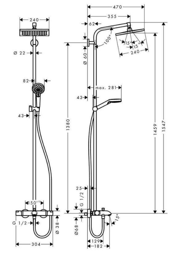 Hệ thống vòi hoa sen bao gồm: Bát sen trần vuông E 240mm, tay sen trần dai 350mm, dây cấp nước, bộ điều chỉnh nhiệt độ, thanh trượt,
