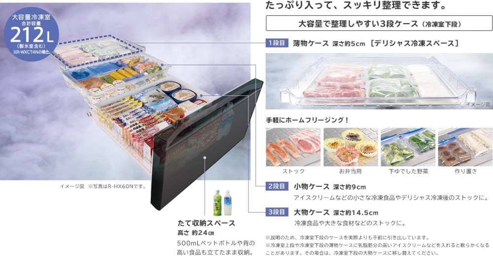 • Ngăn đông 3 tầng và ngăn bảo quản thực phẩm có chiều cao (Ngăn đông dưới