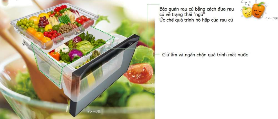 Rau củ sau khi thu hoạch, chúng sẽ tiếp tục hô hấp và tiêu hao năng lượng, chính điều này làm cho rau củ mất đi sự tươi ngon vốn có. Trong phòng rau củ của tủ lạnh R-WXC62S dưới tác dung của chất xúc tác và khí cacbonic, quá trình hô hấp của rau củ bị ức chế (đưa về trạng thái “ngủ”) từ đó bảo vệ được sự tươi ngon như vừa thu hoạch.